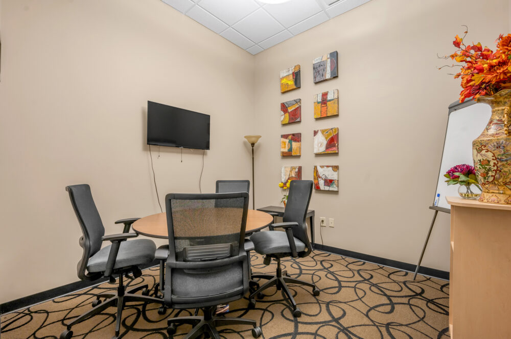 Small office with round table, four chairs and AV equipment (seats up to four-five people total).